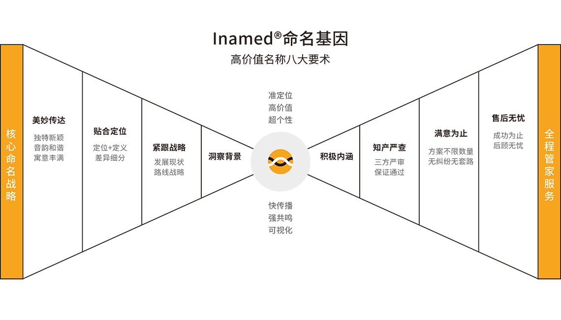 根據(jù)目標(biāo)群體需求特征以及品牌起名定位,通過字義、字音、字性等多種方法,創(chuàng)意命名方案;對名稱進(jìn)行商標(biāo)注冊系統(tǒng)篩查等。